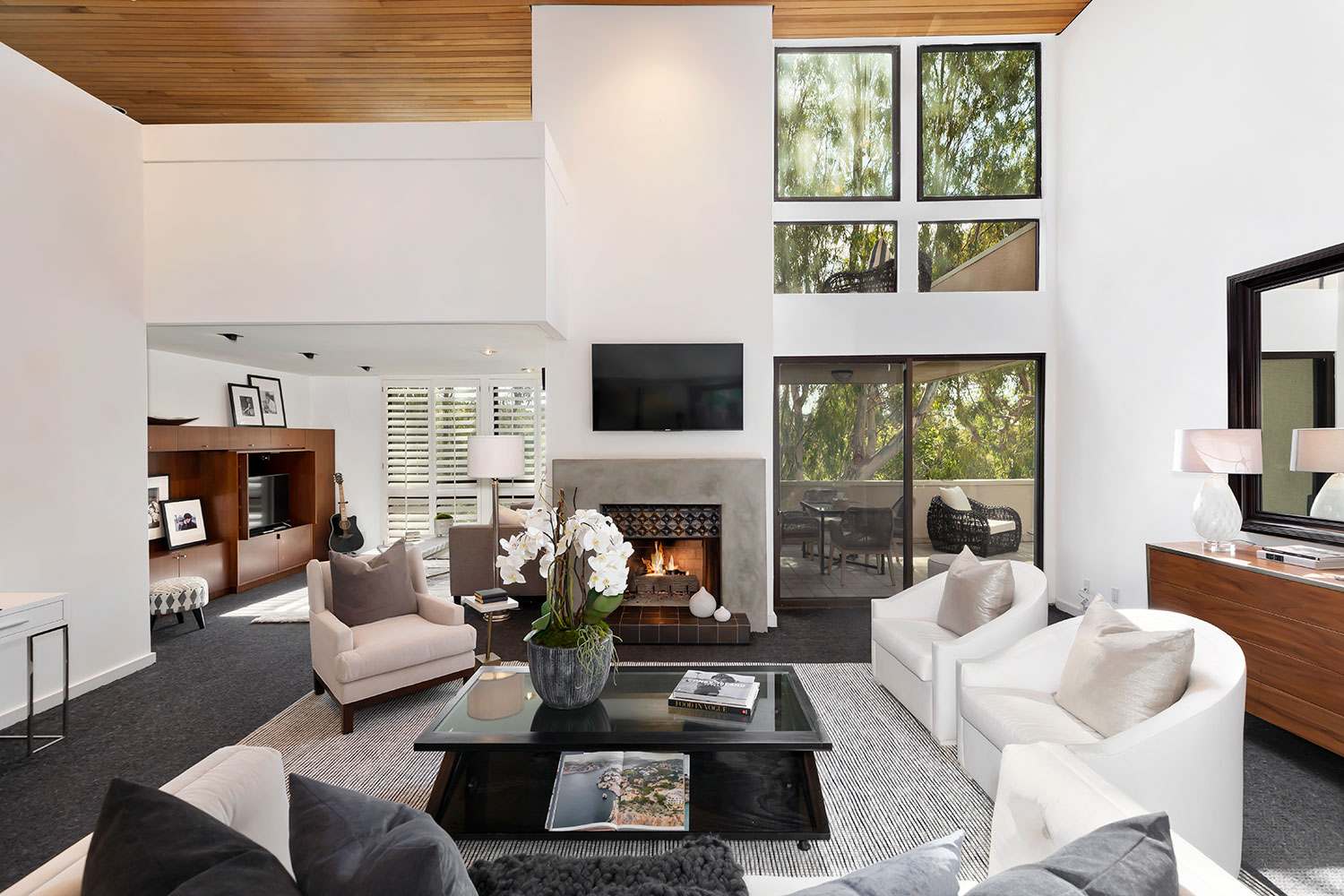 You have arrived! Rare Top Floor Penthouse Living. Secluded, private & serene. Enter through the substantial double doors and you are graciously greeted by soaring ceilings, volume & natural light. Primarily a single-level home, it exemplifies spaciousness while remaining cozy w/ intimate settings. This unique and special property includes LR, Family Media Area, Dining Area, Breakfast Area, Kitchen w/ SubZero & SieMatic cabinets & drawers, as well as the additional loft space w/ fireplace and patio that can transform to Office or guest room. Surrender to the Master bedroom patio where you can relax & unwind in the hot tub or near the glowing fire pit. Cozy up to any of the three additional Fireplaces while entertaining on any of the three sizable patios, all overlooking a forest of gorgeous eucalyptus trees. Wonderful floor plan w/ indoor/outdoor flow & appeal. 2-Car parking (SxS). Abundant storage. Building amenities include 2 community areas, pool, elevator & guest prkg. A Must See!